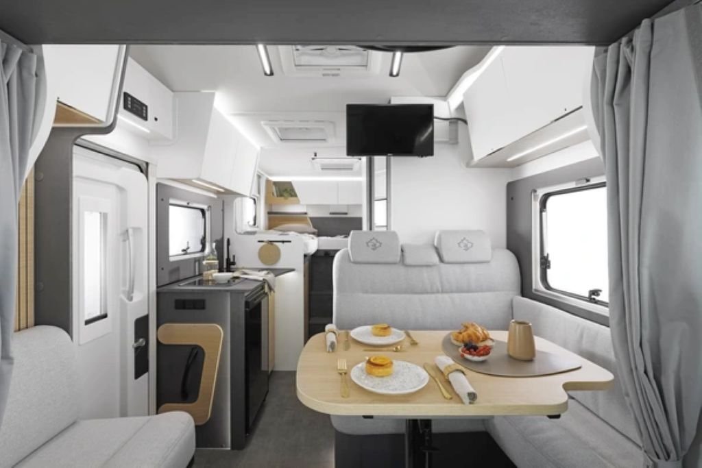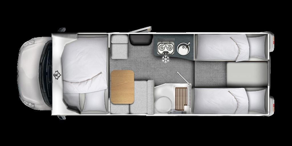 Obytný vůz A 690 je ideální pro rodiny a každého, kdo ocení dostatek prostoru. Prostorná manželská postel se nachází ve výklenku nad kabinou řidiče a v zadní části čekají dvě pohodlná samostatná lůžka – takže si každý najde to své. Chytrá úložná řešení, plně vybavená kuchyň a praktická koupelna zajišťují pohodlnou cestování. Ergonomické matrace s lamelovým roštem a nabíjecími porty u postele nabízejí další pohodlí. Ti, kteří potřebují více místa na spaní, mohou A 690 rozšířit o volitelné lůžko s jídelním koutem. Díky kompletní karoserii z laminátu, vylepšené izolaci a moderní technologii Renault Master můžete cestovat bezpečně a pohodlně v každém ročním období.