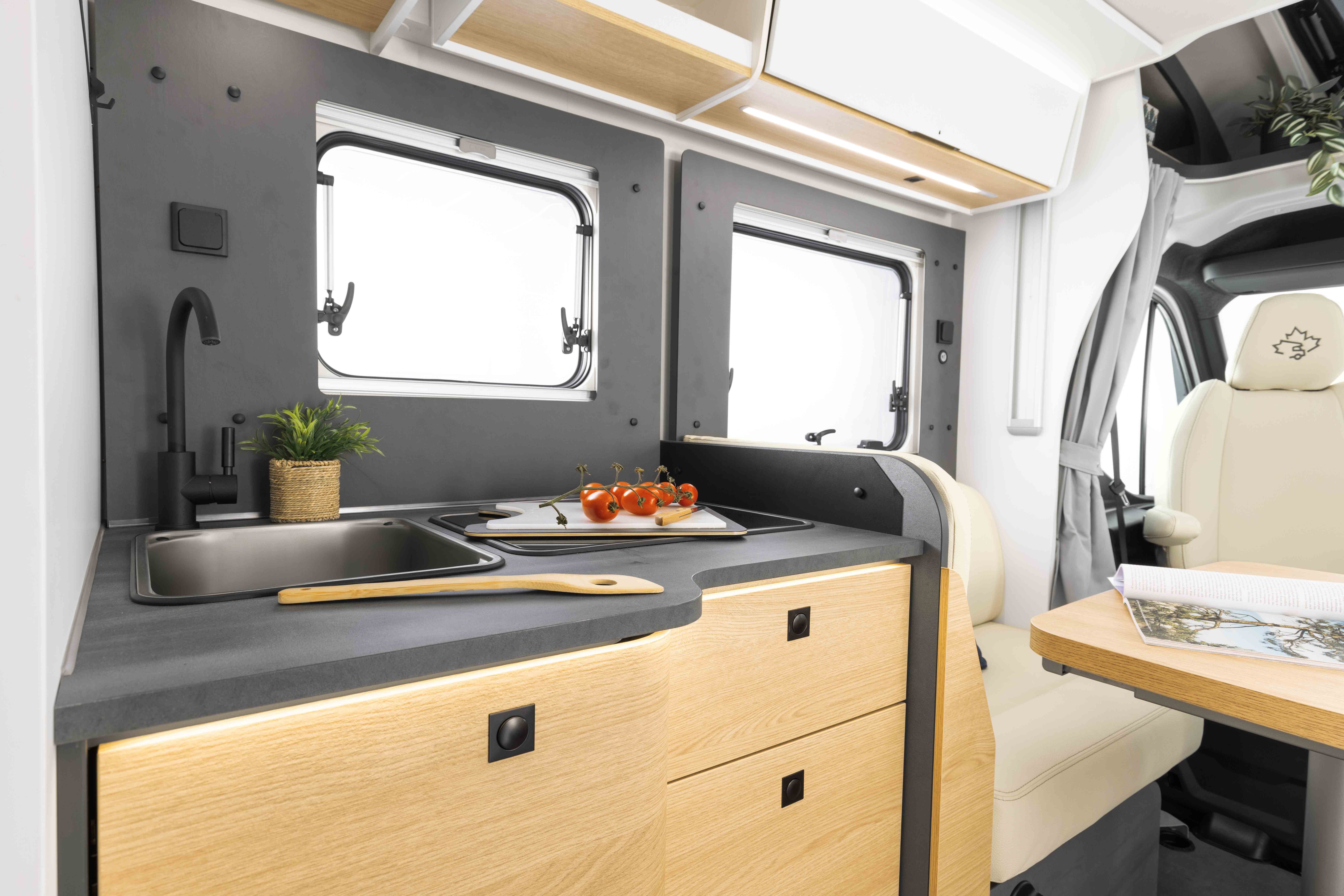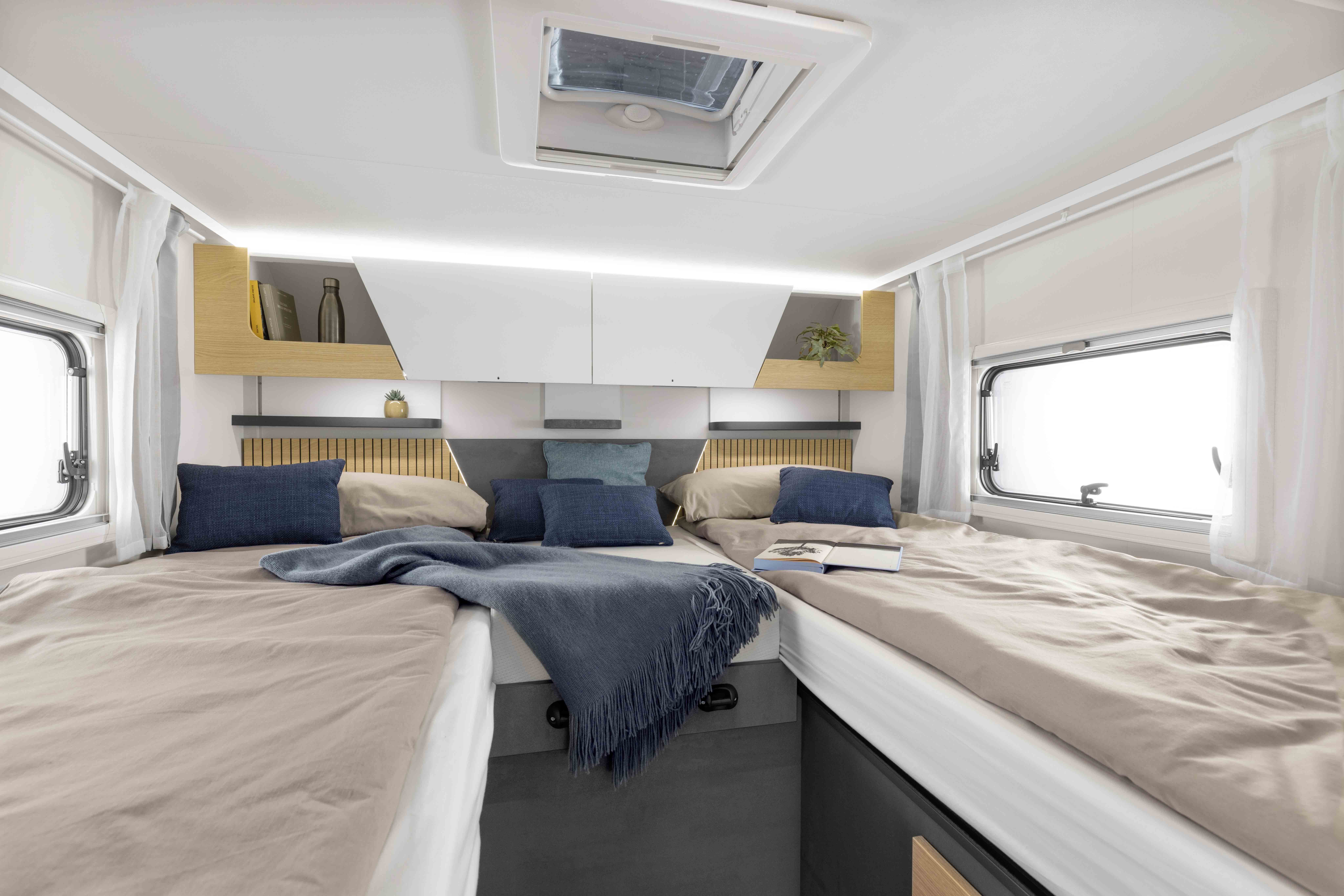 Částečně integrovaný Ahorn Camp TE 740 nabízí v zadní části dvě pohodlná samostatná lůžka, která lze v případě potřeby spojit a vytvořit tak jednu velkou spací plochu – ideální pro klidné noci na dlouhých cestách. Promyšlený půdorys vytváří prostorný obývací prostor s pohodlným posezením, plně vybavenou kuchyň a samostatnou koupelnu se sprchovým koutem. Pohodlí a bezpečnost zajišťují četné úložné prostory a moderní Renault Master s celolaminátovou karoserií a účinnou izolací. Ti, kteří potřebují další prostor na spaní, mohou TE 740 rozšířit o volitelnou postel s jídelním koutem nebo elektricky skládací postel nad jídelním koutem.