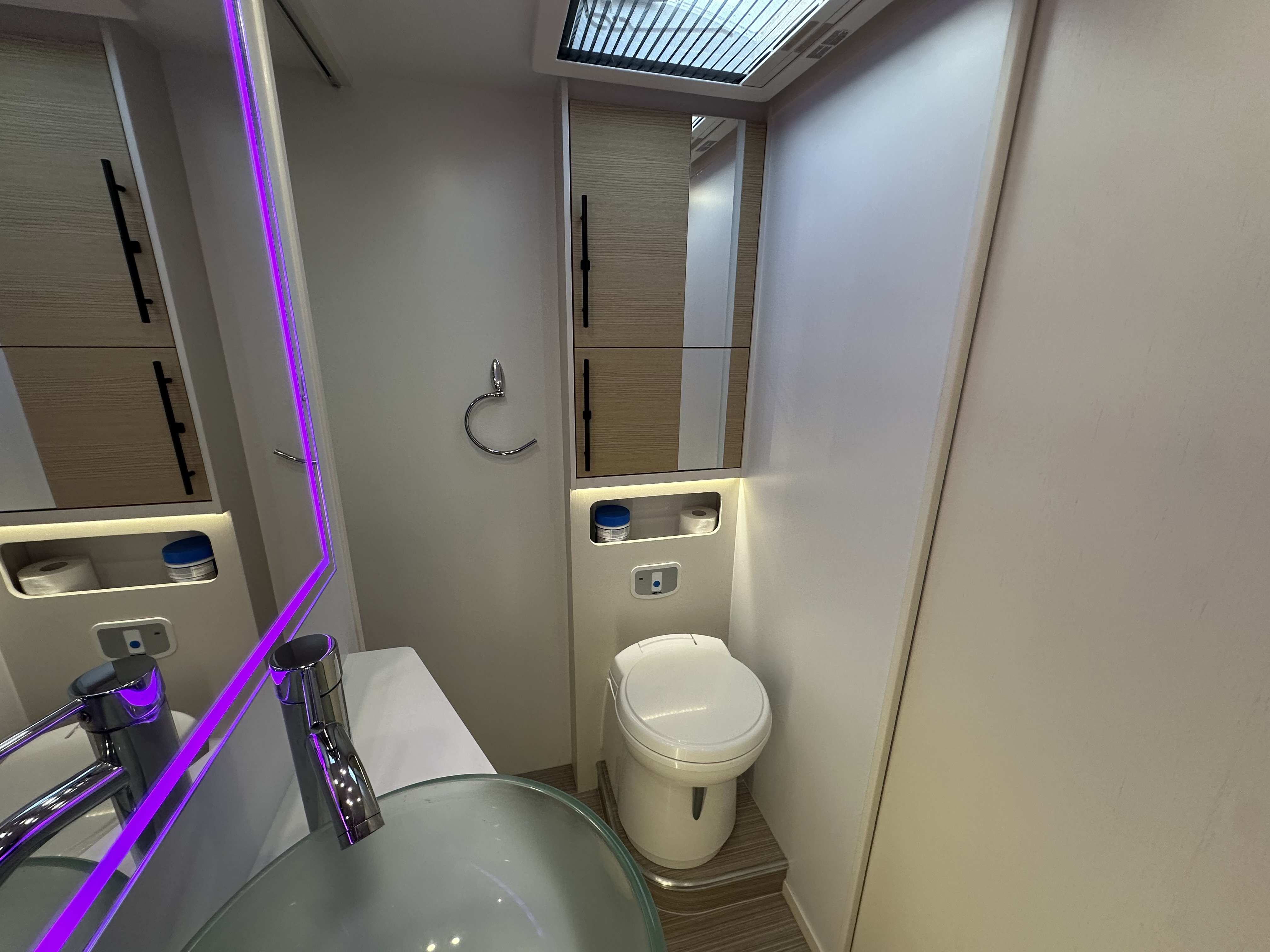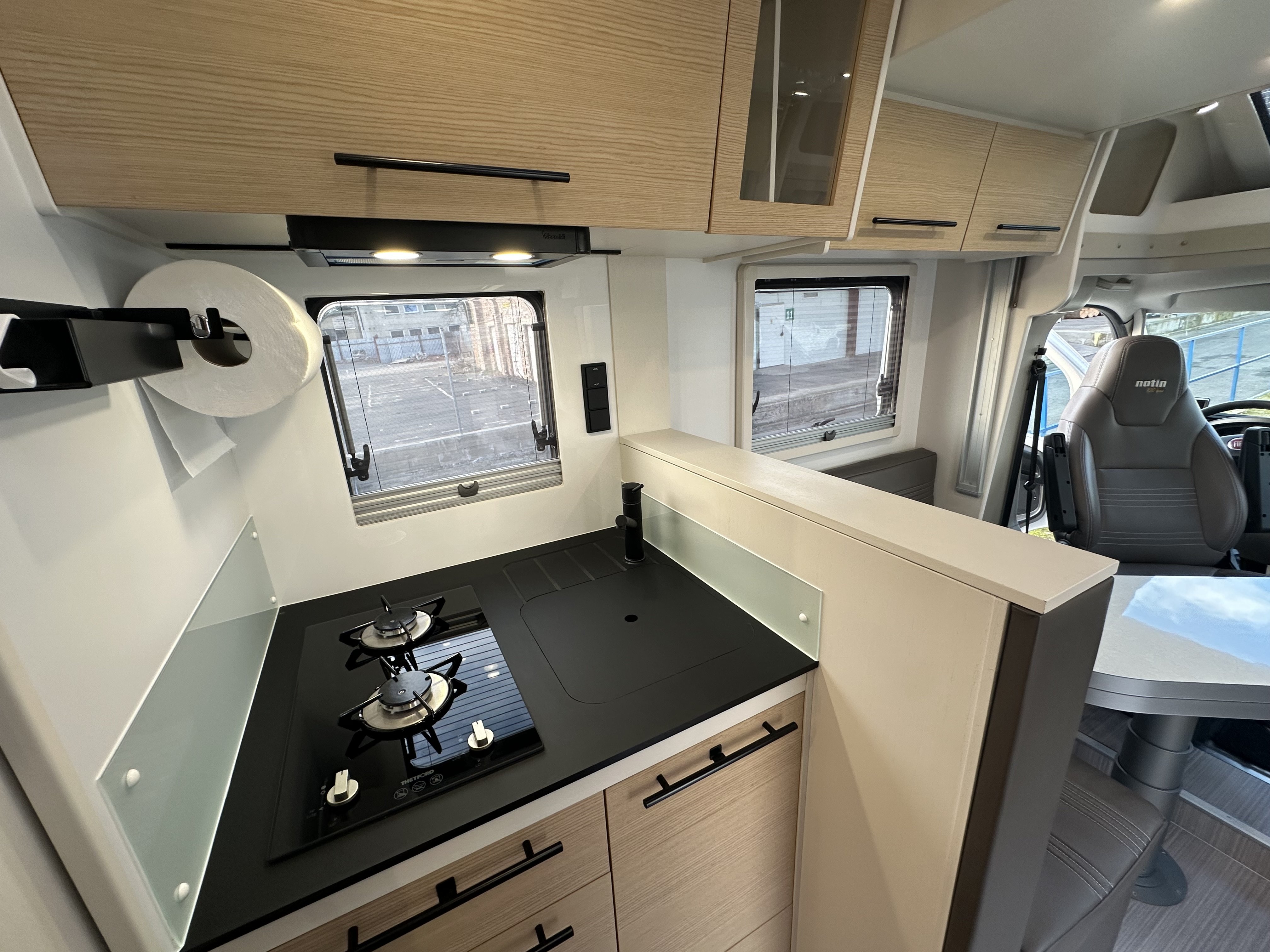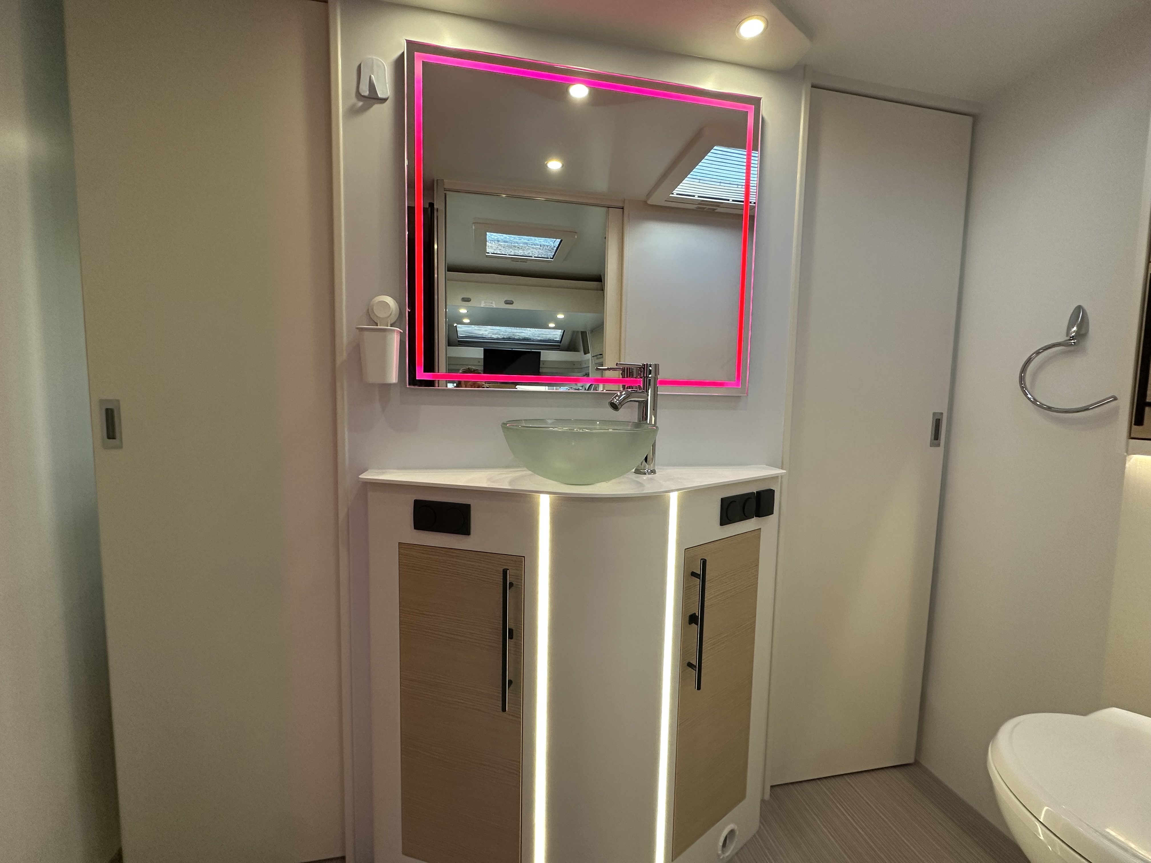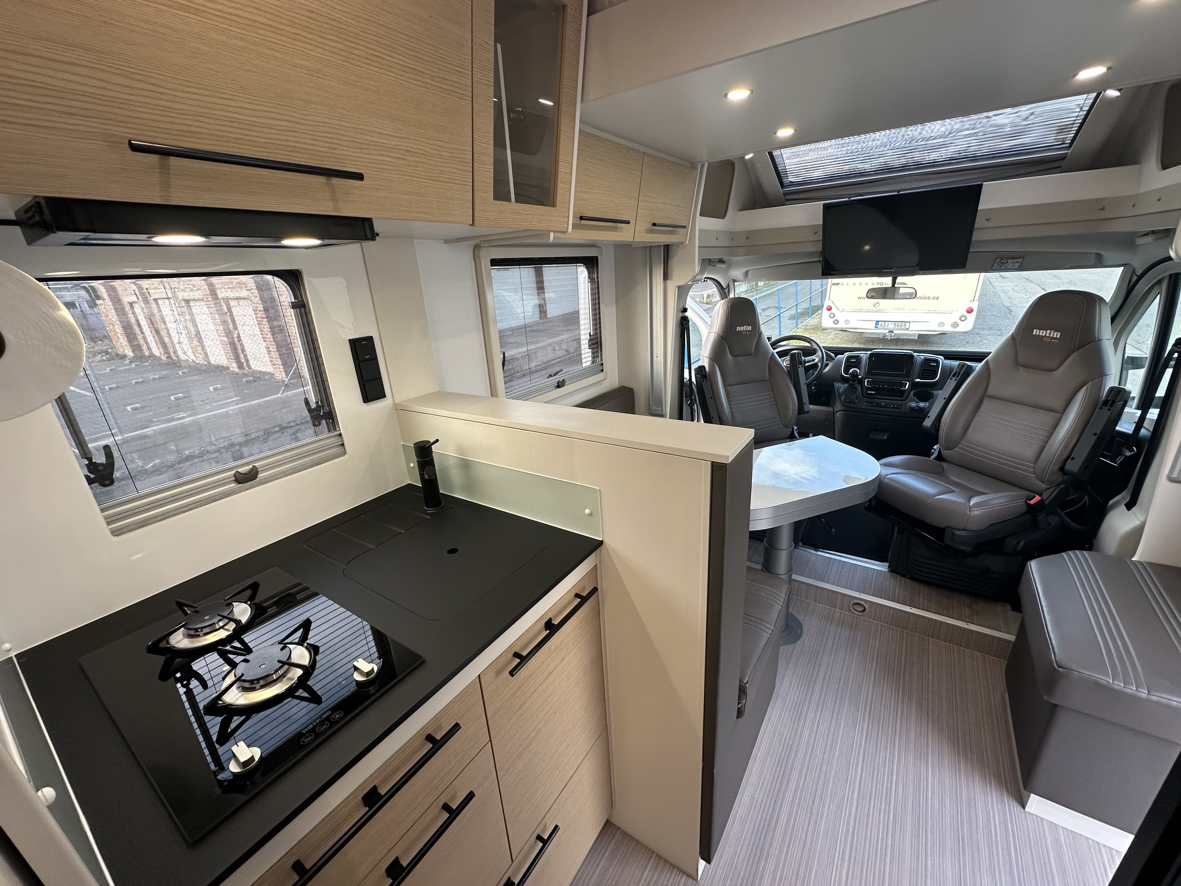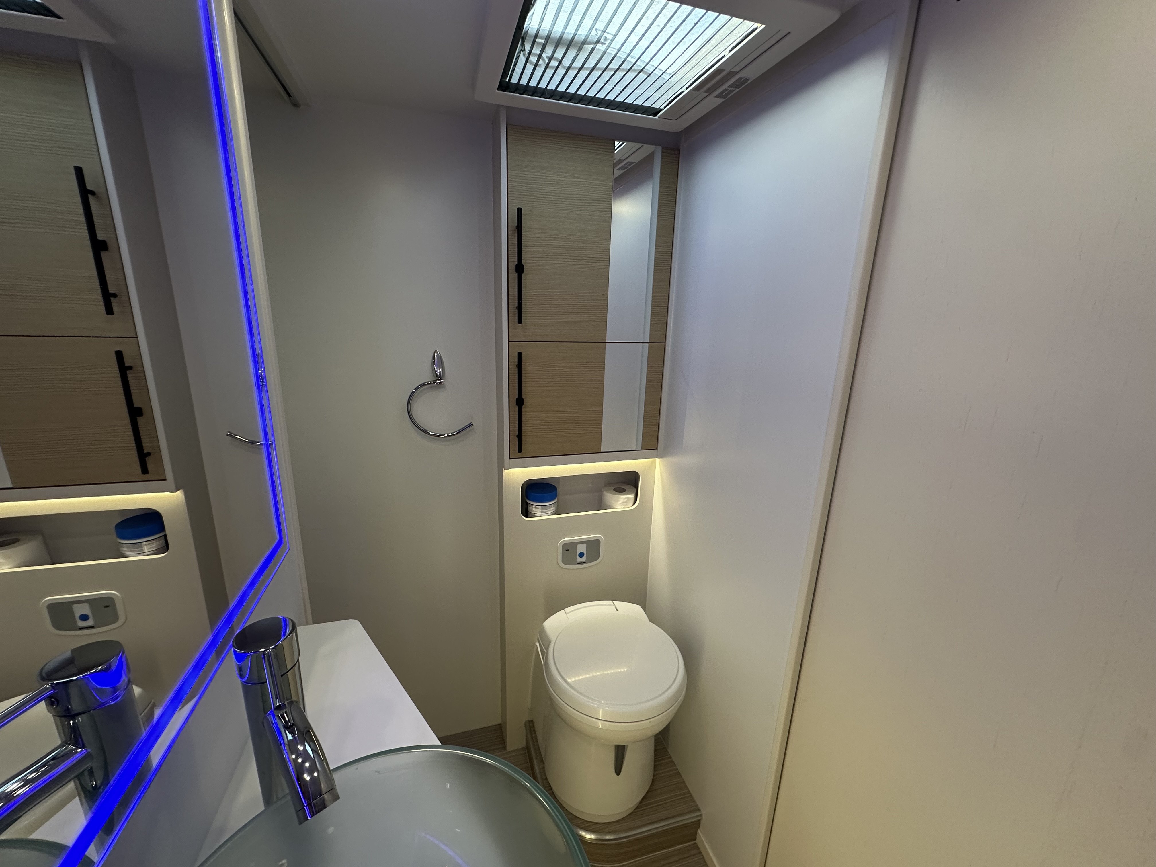 Jedná se o polo-integrovaný vůz od výrobce NOTIN CAMPING CARS kde na první pohled zaujme prostorná koupelna s nestandardním řešením. Koupelna je totiž od ložnice oddělena pevnou středovou zástěnou s integrovanými šoupacími dveřmi po obou stranách. Ve středu koupelny vévodí skříňka s velkým osvětleným zrcadlem a skleněným umyvadlem. Na pravé straně je umístěný sprchový kout a po levé toaleta. Pomocí zašupovacích dveří lze koupelnu plně oddělit od ložnice a obývací části čímž vznikne velmi prostorná místnost pro veškerou očistu.