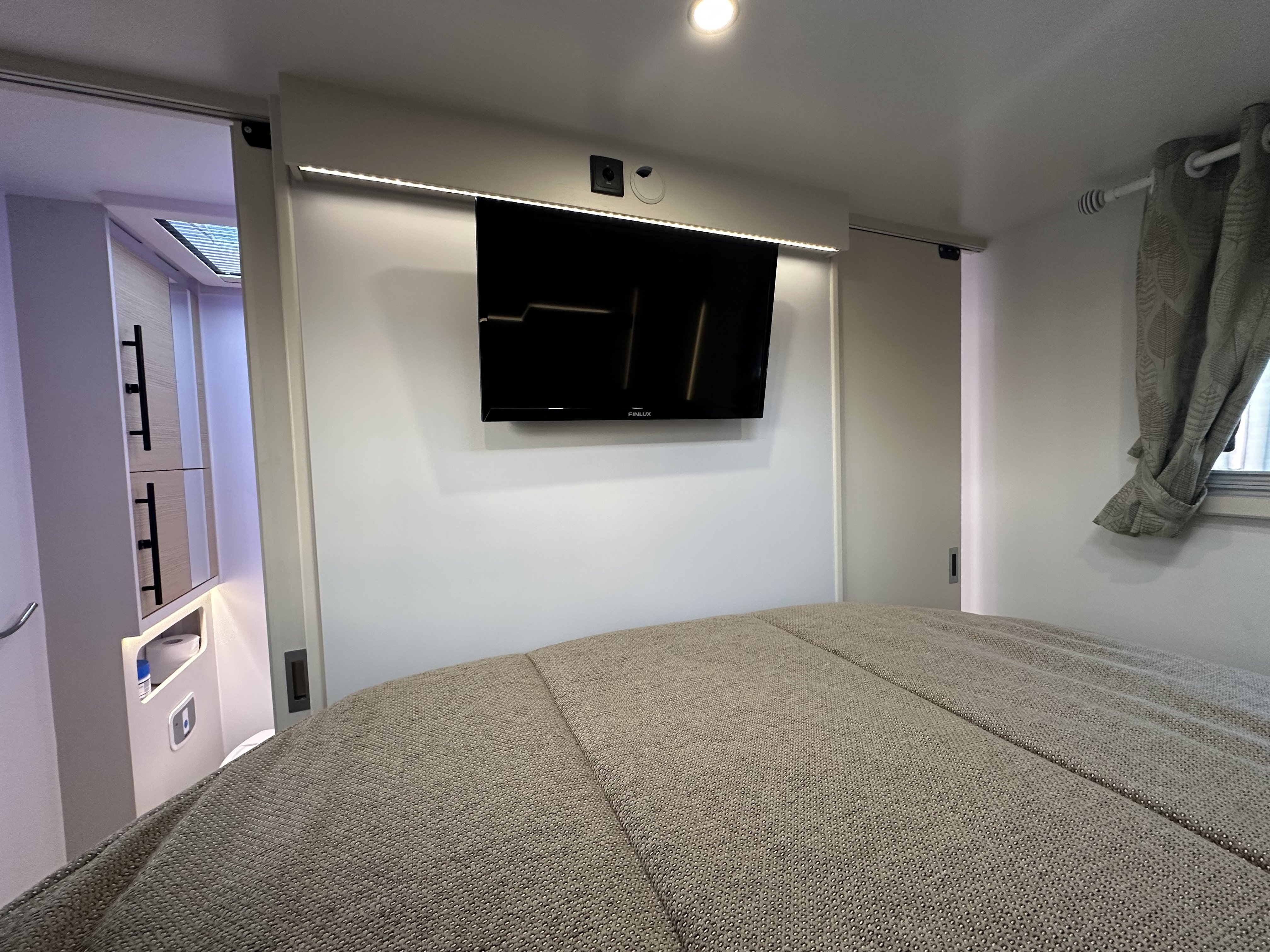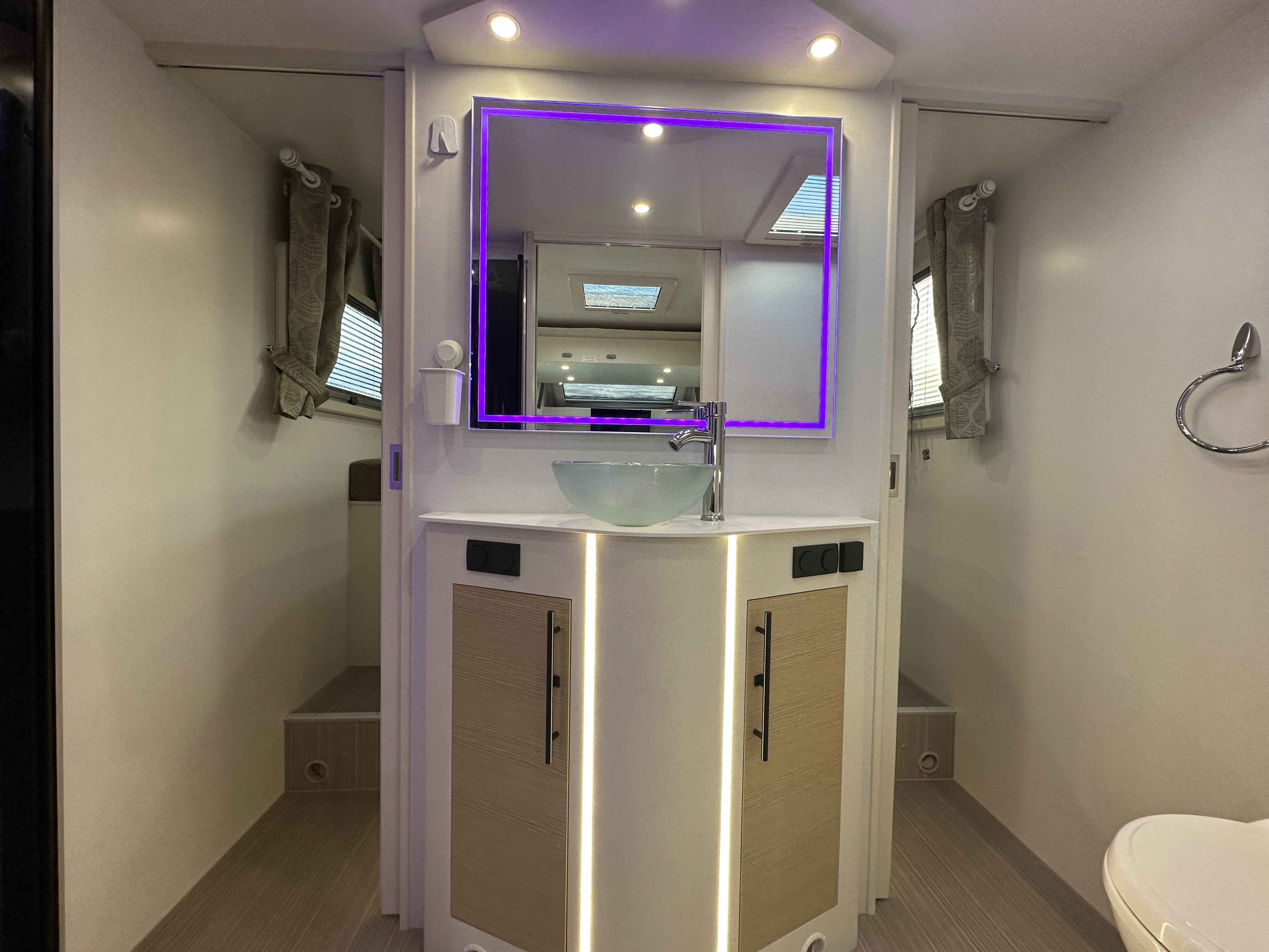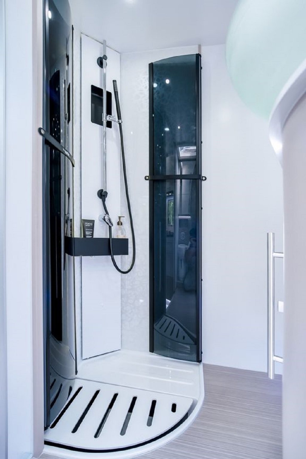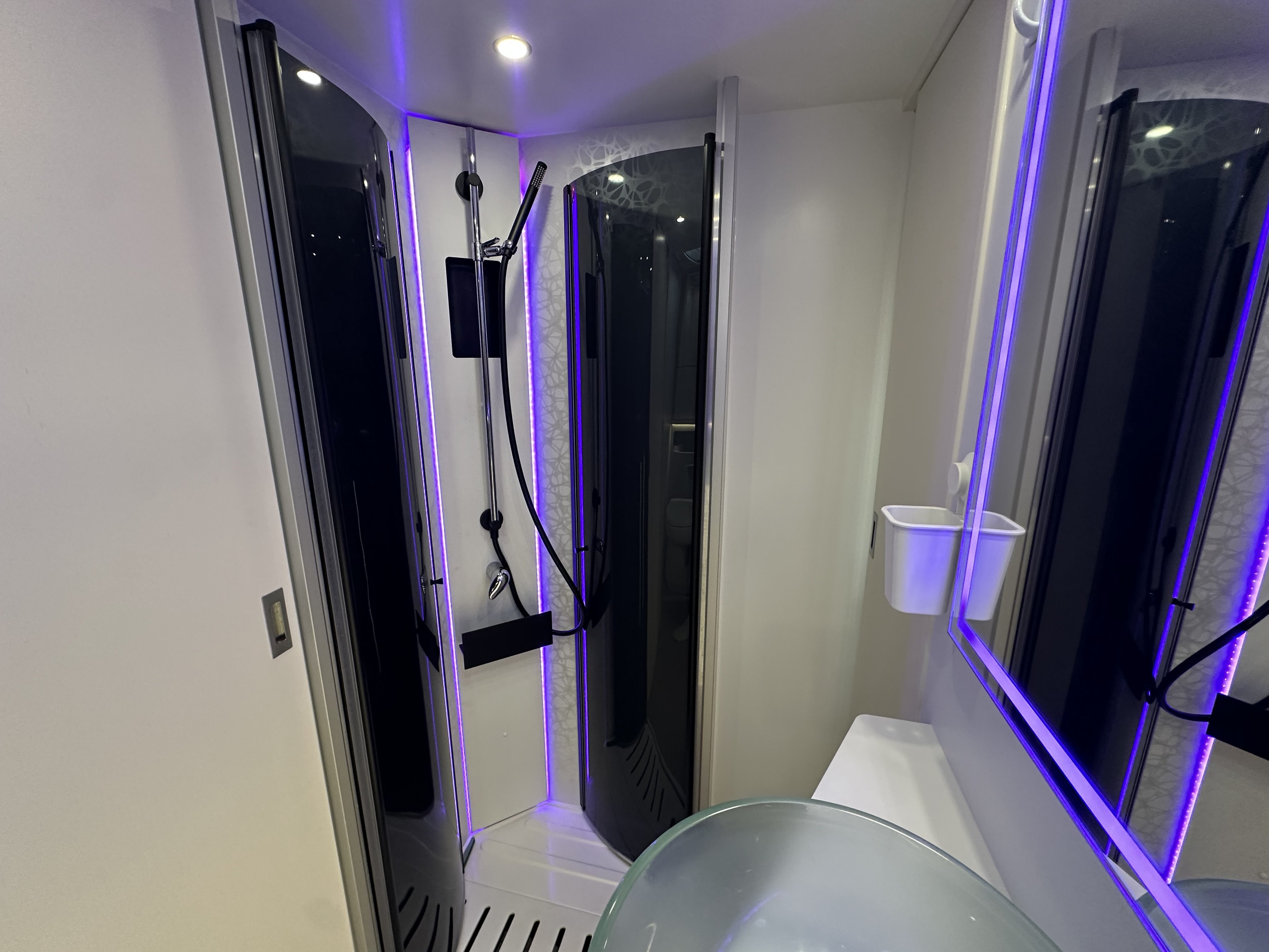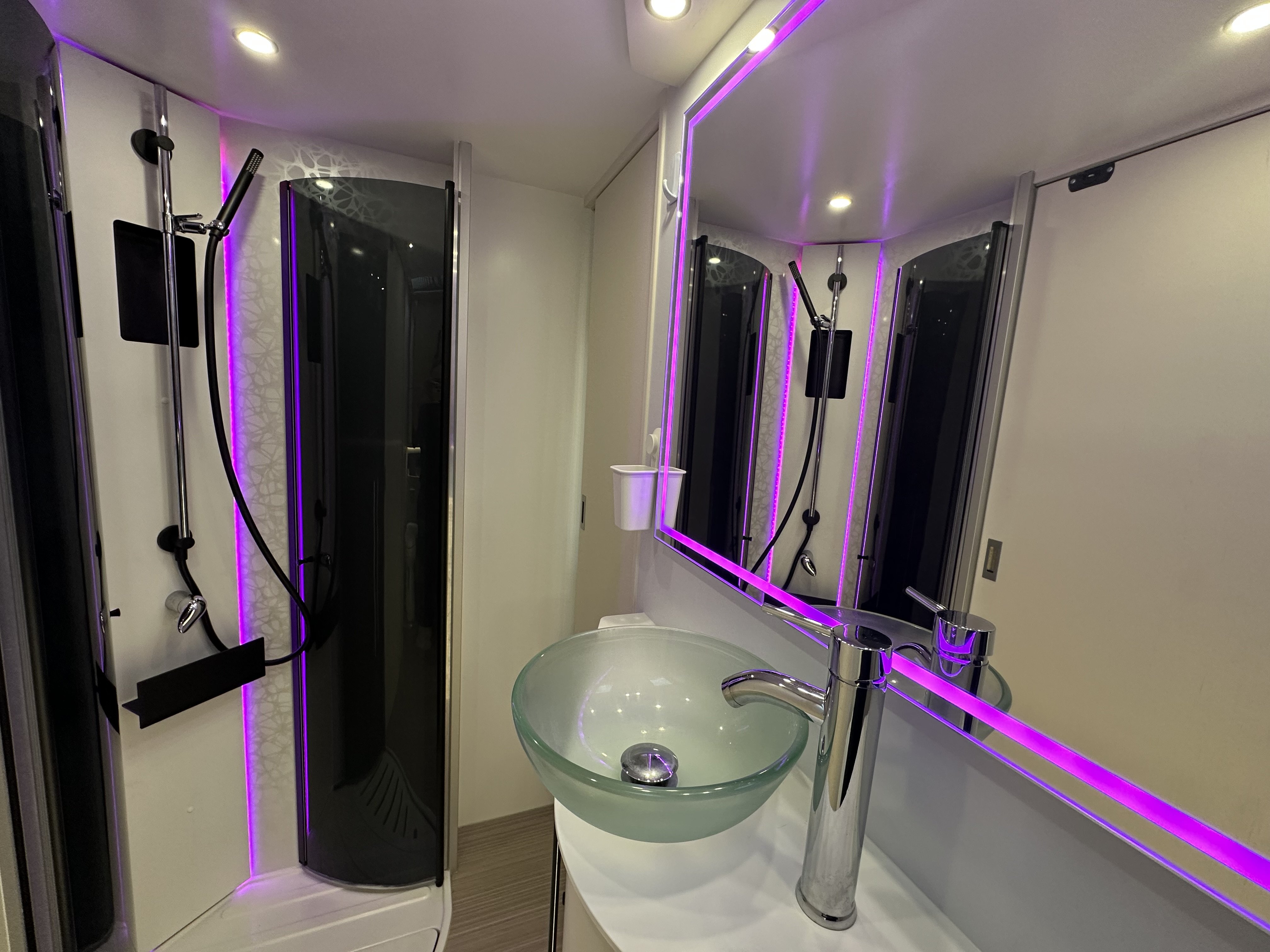 Jedná se o polo-integrovaný vůz od výrobce NOTIN CAMPING CARS kde na první pohled zaujme prostorná koupelna s nestandardním řešením. Koupelna je totiž od ložnice oddělena pevnou středovou zástěnou s integrovanými šoupacími dveřmi po obou stranách. Ve středu koupelny vévodí skříňka s velkým osvětleným zrcadlem a skleněným umyvadlem. Na pravé straně je umístěný sprchový kout a po levé toaleta. Pomocí zašupovacích dveří lze koupelnu plně oddělit od ložnice a obývací části čímž vznikne velmi prostorná místnost pro veškerou očistu.