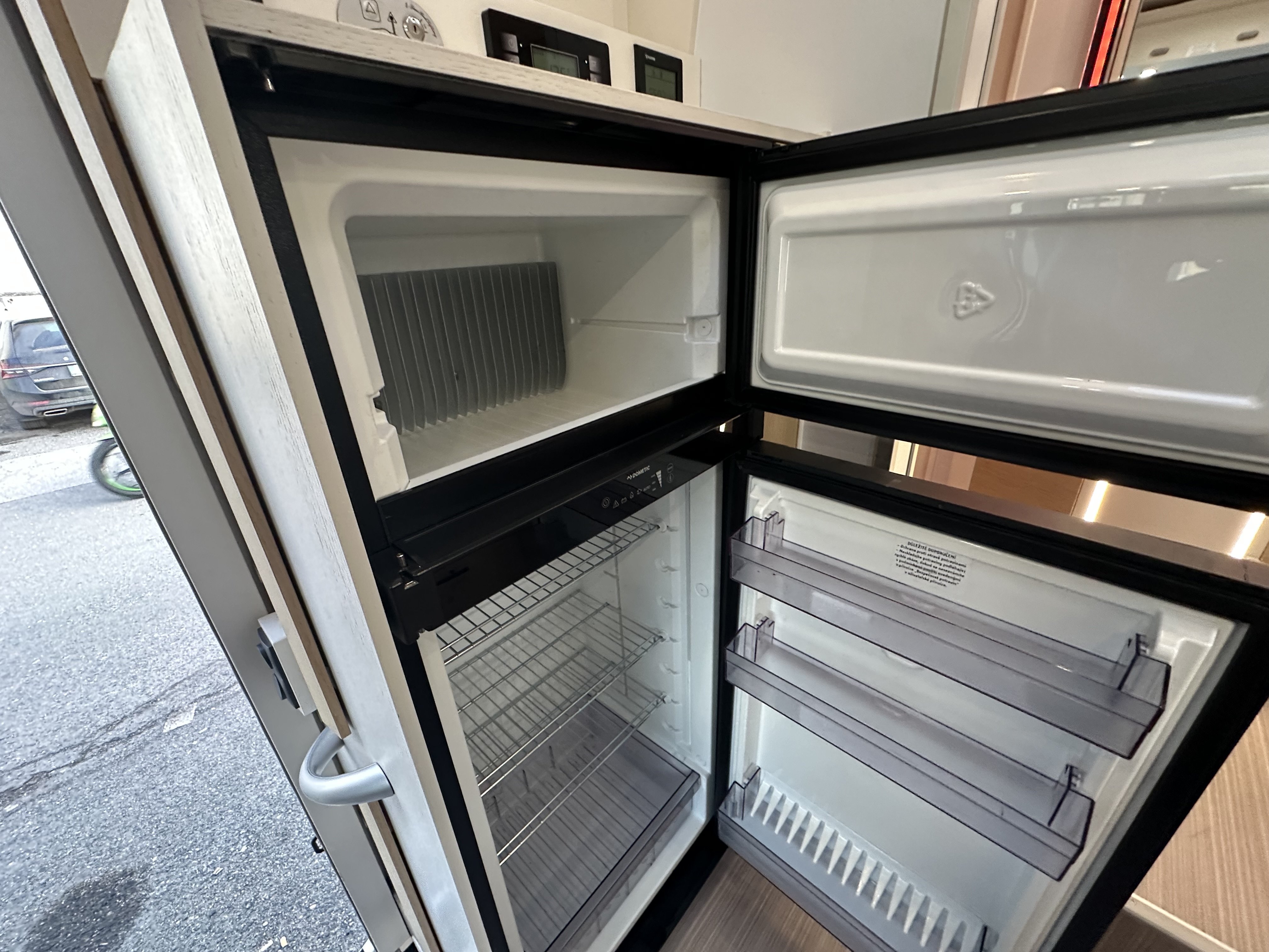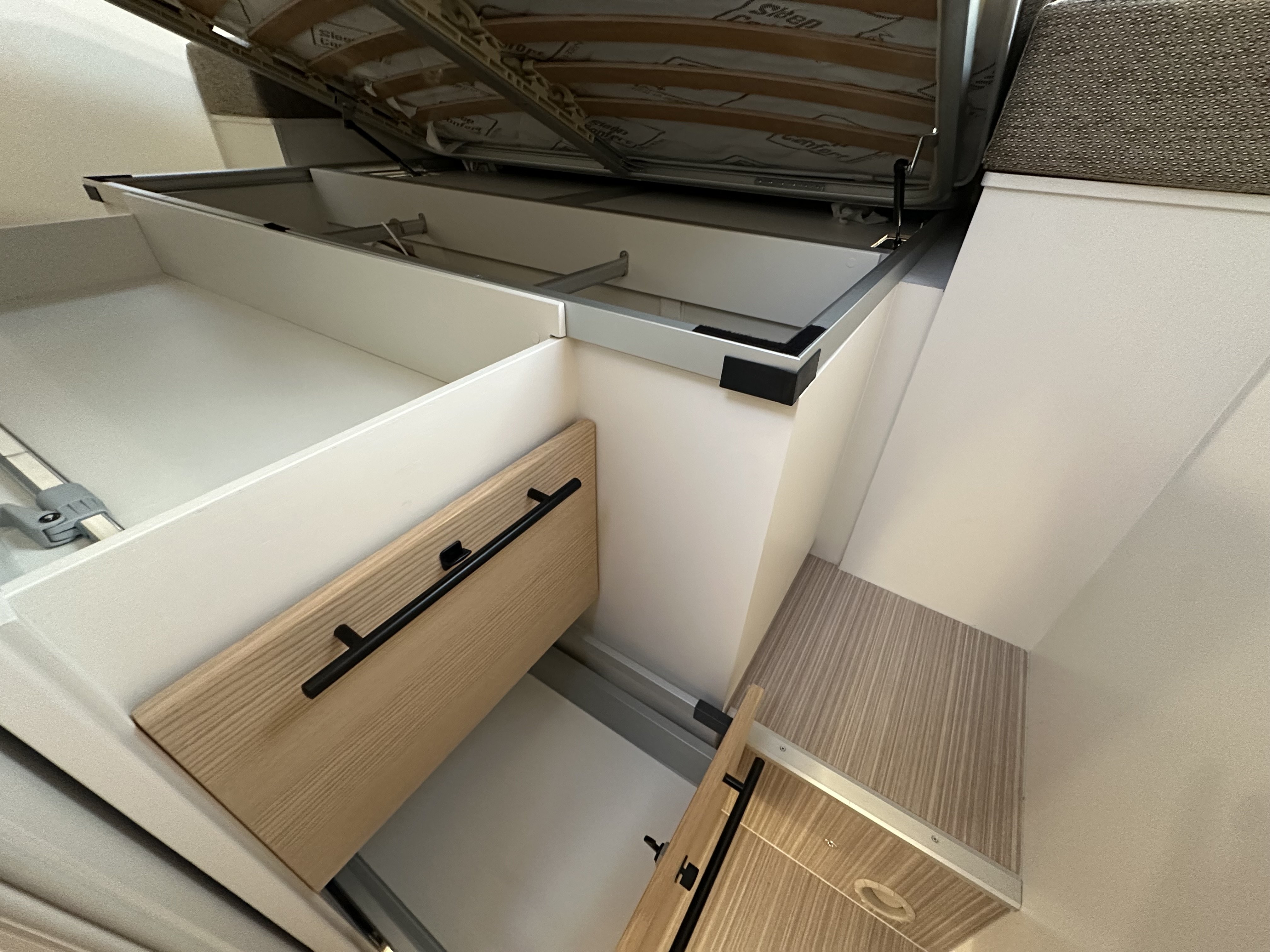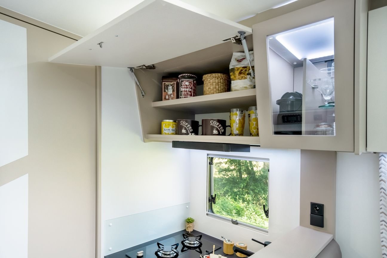 Ložnice vozidla je uspořádána se středovým lůžkem se zadním rozšířením. Díky pevné středové stěně je v ložnici dostatek soukromí pro Váš odpočinek. Kuchyňka je již standardně vybavená ledničkou Dometic s odděleným mrazákem, pracovní deskou vyrobenou z Polyrey, digestoří a dvou-plotýnkovým sporákem. Veškeré skříňky jsou vybaveny systémem SOFT-CLOSE vyrobené ze dřeva. Novinkou je elektricky sesuvná skříňka s vestavěným kávovarem a barovým držákem sklenic. Rohové sezení čalouněné ve 100% kůži a polohovací stolek s otočnými sedadly v kabině zajistí dostatek komfortu pro trávení volného času ve vozidle.