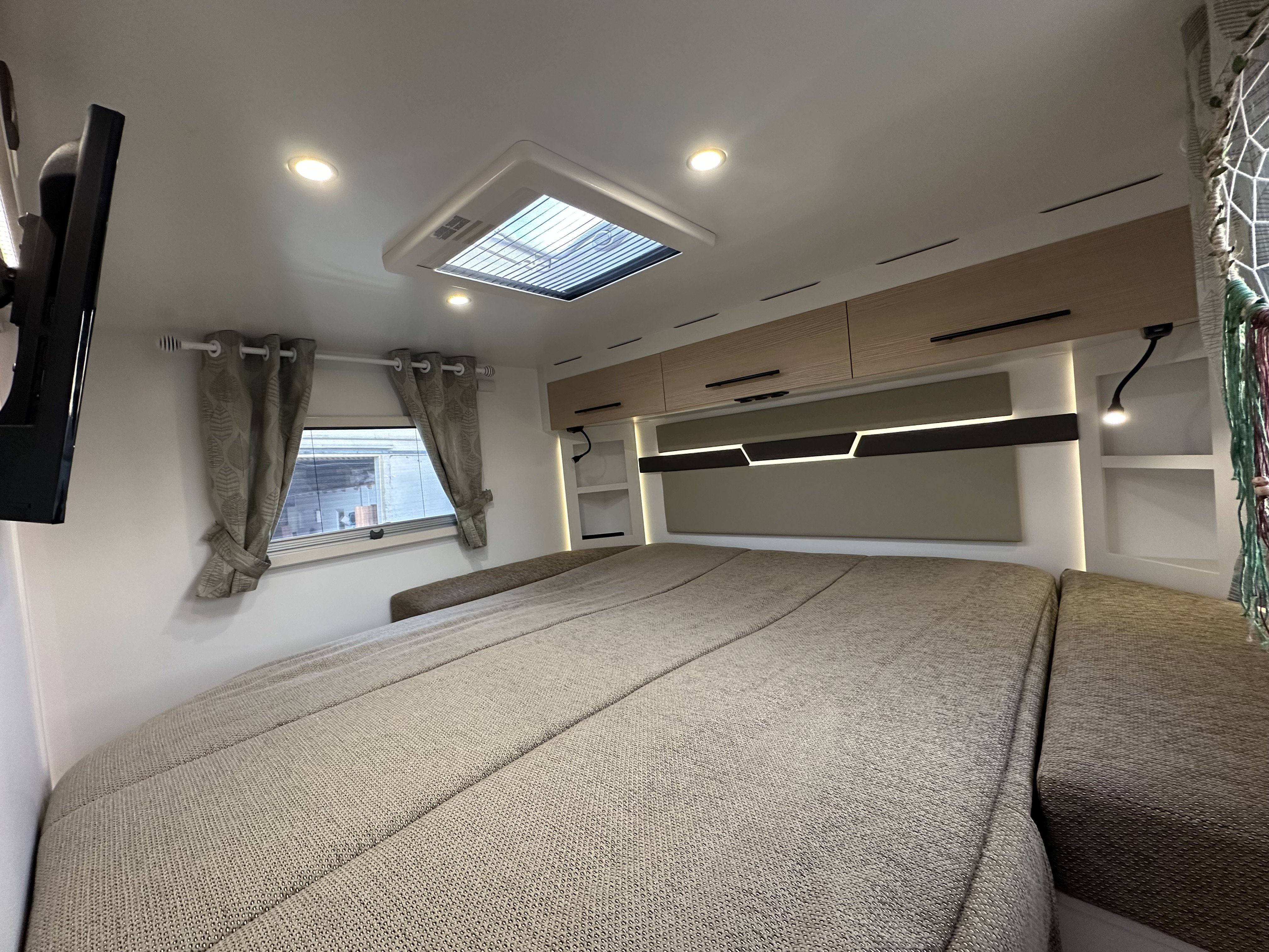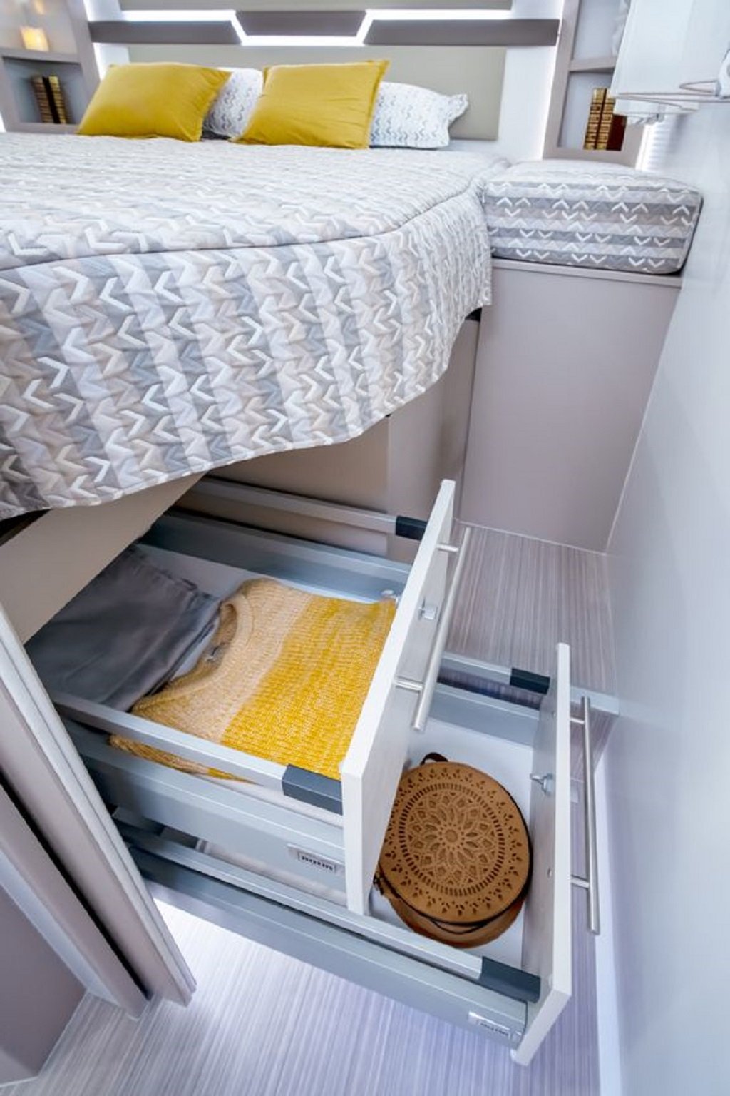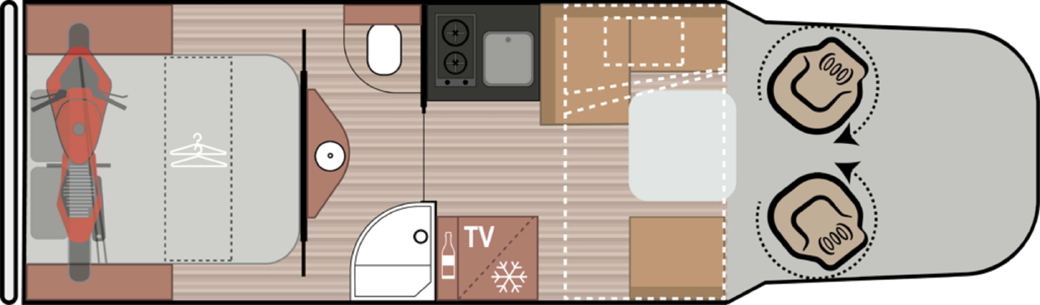 Ložnice vozidla je uspořádána se středovým lůžkem se zadním rozšířením. Díky pevné středové stěně je v ložnici dostatek soukromí pro Váš odpočinek. Kuchyňka je již standardně vybavená ledničkou Dometic s odděleným mrazákem, pracovní deskou vyrobenou z Polyrey, digestoří a dvou-plotýnkovým sporákem. Veškeré skříňky jsou vybaveny systémem SOFT-CLOSE vyrobené ze dřeva. Novinkou je elektricky sesuvná skříňka s vestavěným kávovarem a barovým držákem sklenic. Rohové sezení čalouněné ve 100% kůži a polohovací stolek s otočnými sedadly v kabině zajistí dostatek komfortu pro trávení volného času ve vozidle.