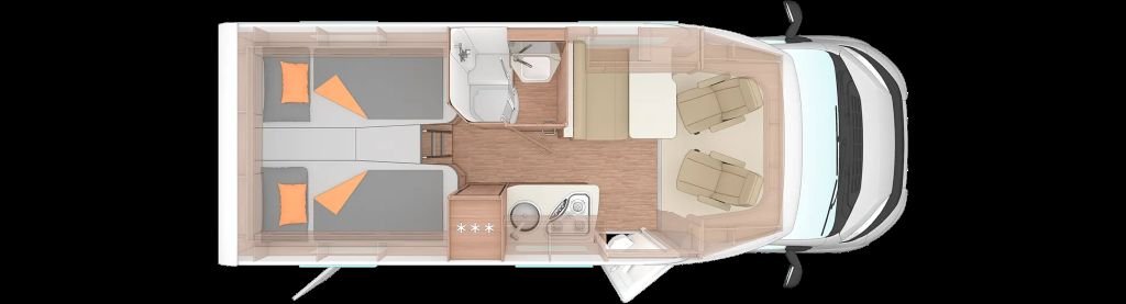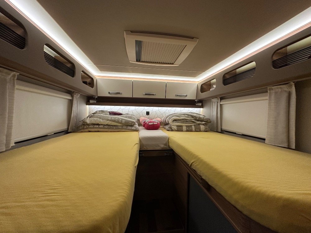 ELEKTRO: CEE venkovní přípojka 230V s jističem, 2x USB zásuvka, LED osvětlení interiéru, nabíječka a booster na baterii nástavby, 3x zásuvka 230V, ambientní osvětlení, anténa Oyster 60 Premium, Twin vč. 24" SMART TV + držák TV